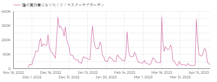 Let’s start with the operations, as there are some good news coming out for Aiming since their past earnings. Master of Garden, the successful release that triggered our interest, has a typical “update-based” grossing pattern. This means we see the game dropping in the ranks (and therefore in revenue), and when the developer drops an update, it flashes back up with existing users buying in-game items. See how that pattern is obvious on our revenue estimate chart for this game (title is in Japanese, Master of Garden being a translation).